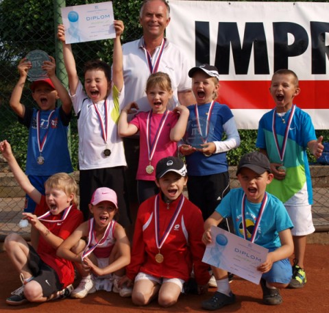 Minitenisté jsou v kraji na 1. a 2.místě .První řada zleva: Slavík J.,Švarcová N.,Křesina A.,VÍTEK M.,stojí zleva: Duroň S.,Šťastný R.,Šulcová V.,Klimovičová L.,Hrazdil J., trenér a vedoucí obou družstev: Ing.Ivo Müller